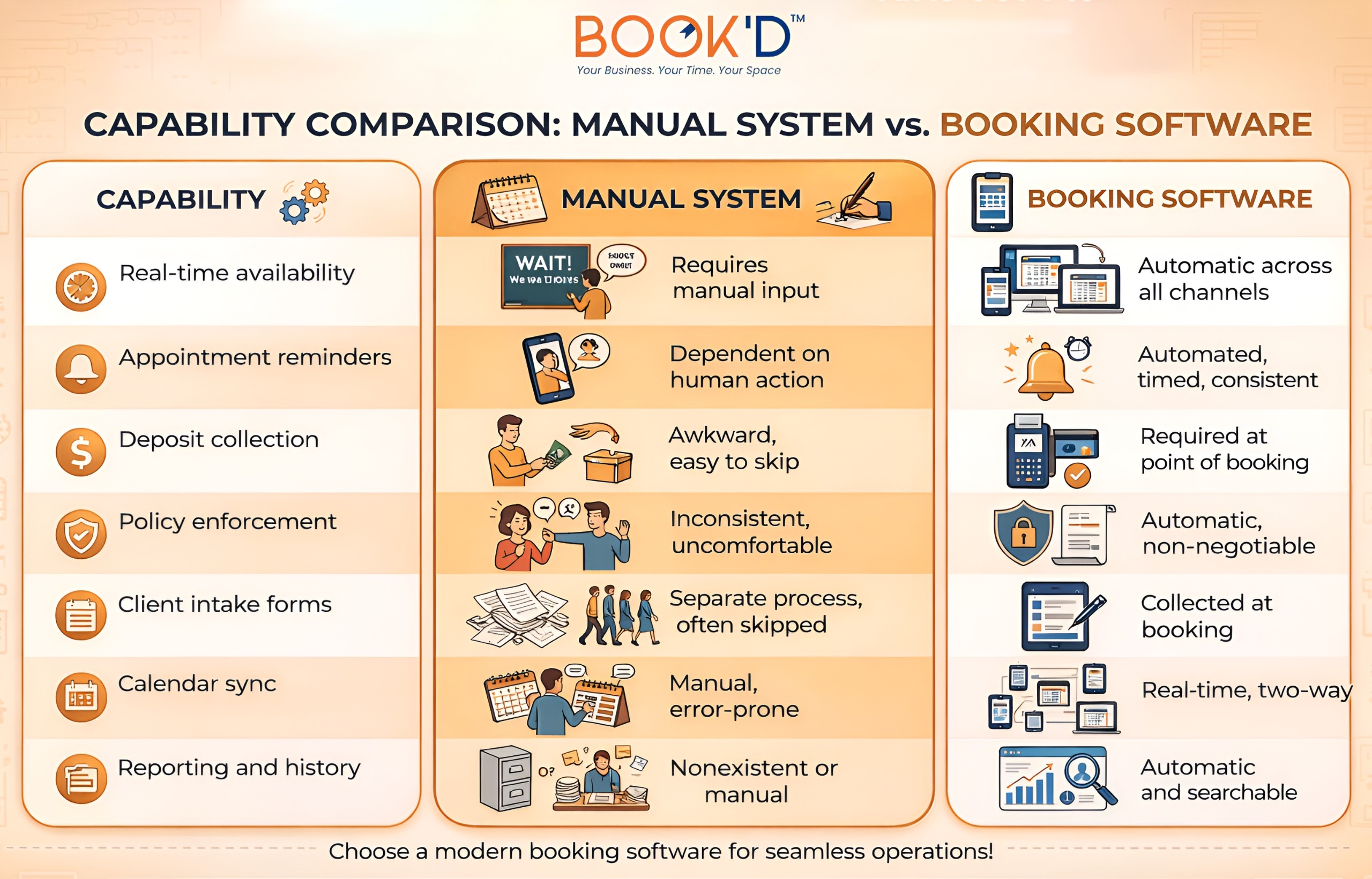 But the manual booking problems that matter most aren’t dramatic. They don’t announce themselves. They accumulate slowly in the background, a double booking here, a no-show that could have been prevented there, a cancellation policy that never really stuck because enforcing it meant having an uncomfortable conversation, until the total cost of all those small failures becomes impossible to ignore.