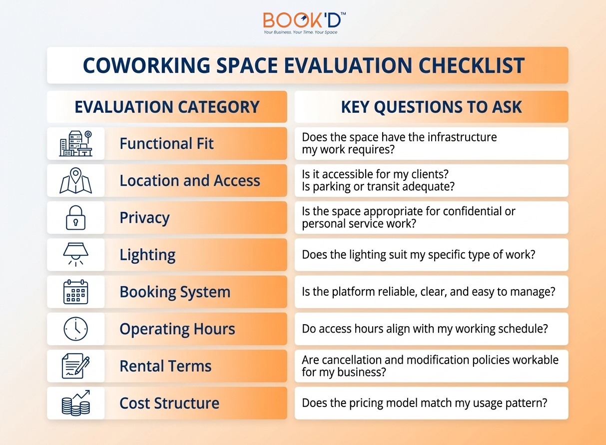 The most common mistakes are leading with price rather than functional fit, failing to visit the space before booking, overlooking operational hour limitations, not reading cancellation and modification terms carefully, and choosing a location that’s convenient for the renter rather than accessible for the client. A clear workspace rental checklist completed before evaluating options prevents most of these mistakes by keeping evaluation criteria objective rather than impression-driven.