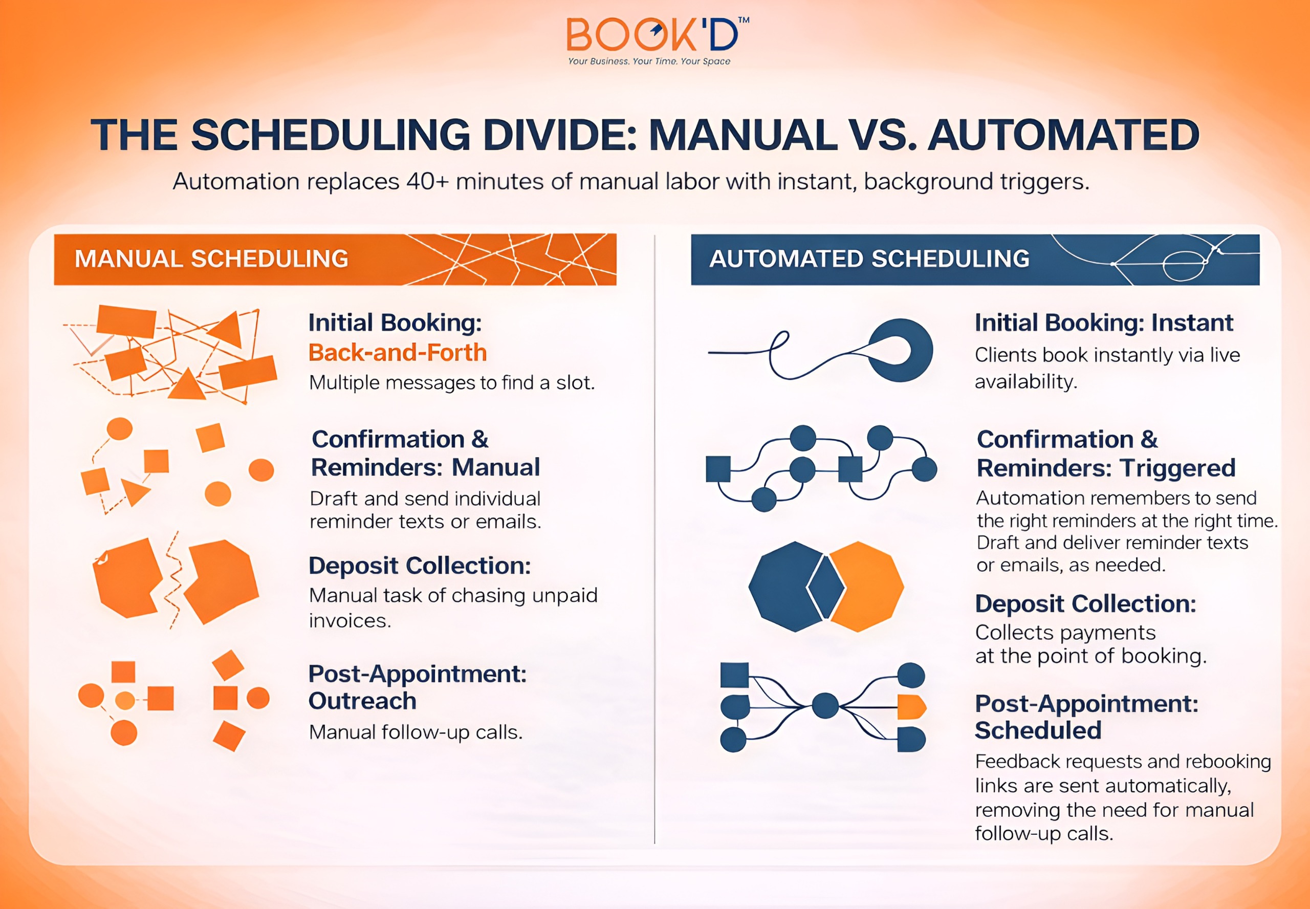 Automated appointment reminders solve that specific problem directly. A message goes out the day before. Another goes out a few hours before. The client is reminded that the appointment exists, given an easy way to confirm or flag if something has changed, and the no-show rate drops. This isn’t a theoretical benefit. It’s one of the most consistently documented effects of booking automation across every kind of service business.