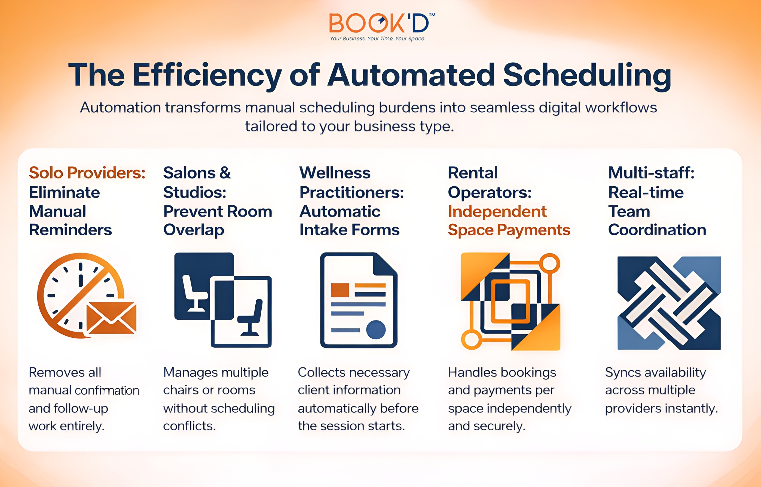 Let’s be honest about something. The actual work, the part you went into business to do, is probably the smallest slice of your day. The rest of it is coordination. Confirmations. Reminders you sent manually because you were nervous about a no-show. Rescheduling conversations that took four messages when they should have taken one. Blocking off time on three different calendars and still ending up with a conflict somehow.